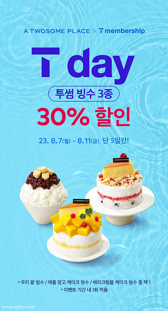 투썸플레이스 X 티멤버십.. 2023 8월 1WEEK 투썸 티데이 혜택은 투썸빙수 30%할인.. 우리팥빙수, 애플망고케이크빙수, 베리크럼블케이크 빙수 중 택1이고, 기간 내 1회 적용이란 내용입니다..