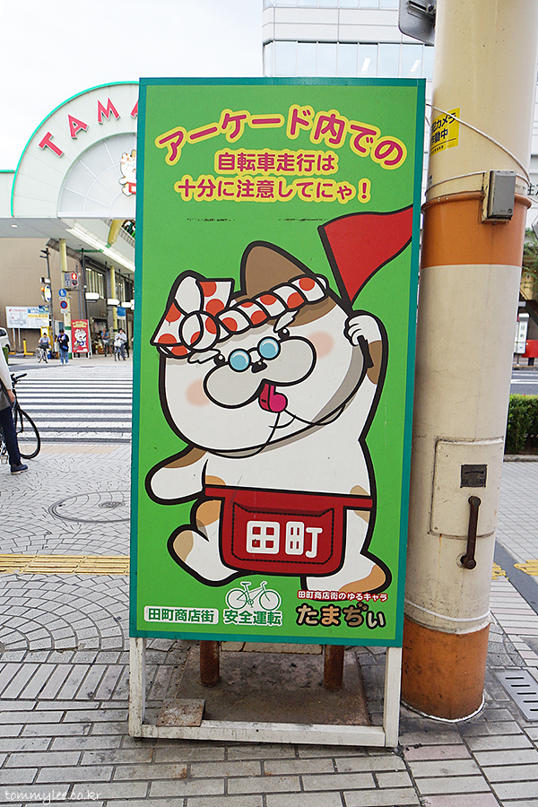 상점가에 이 배너가 곳곳에 붙어 있는데요.. 아케이드 내에서 자전거 주행은 충분히 주의를 기울여 달라는 내용입니다.. 타마치 상점가 캐릭터인 타마치이가 안전 운전하라고 하네요.. 이런 작은 상점가에도 유루캬라가 있다니 대단하죠??..