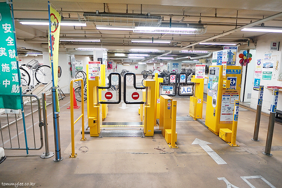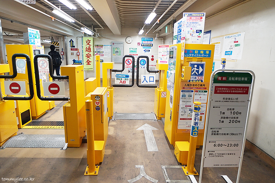 유료 자전거 주차장인말큼 이렇게 주차료를 낼 수 있게 정산기가 달린 입출구가 있는 모습이고요.. 자전거 주차요금은 1회 100엔, 원동기장치자건거(50cc이하니까 스쿠터라고 보시면 되겠죠) 요건 200엔이라고 합니다.. 이용시간은 06:00~23:00..