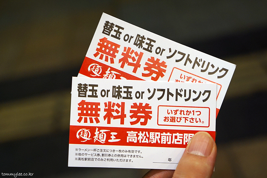다 먹고 나가려고 하니 직원분께서 이렇게 쿠폰을 쥐어 주셨답니다.. 내일 한국으로 돌아가서 이 쿠폰을 사용할 수는 없겠지만 뭐 암튼 주셨으니 찰칵.. 카에타마 또는 아지타마 또는 소프트드링크 무료권이라고 써있습니다.. 소프트드링크 무료쿠폰으로 메론소다 마시는 게 이득이겠네요.. 타카마츠에서 우동만 계속 먹기 지겨우시다면 1식은 토쿠시마라멘으로 해보세요.. 카가와 옆의 토쿠시마의 맛을 저렴한 가격에 즐기실 수 있답니다..