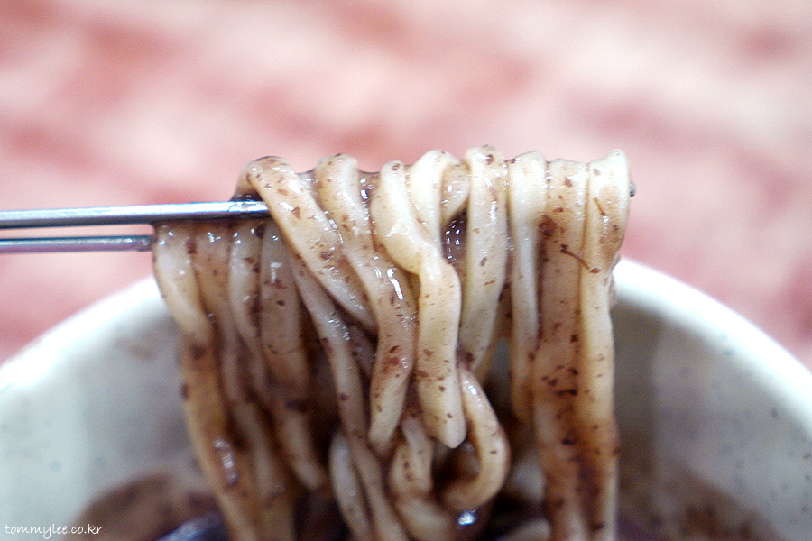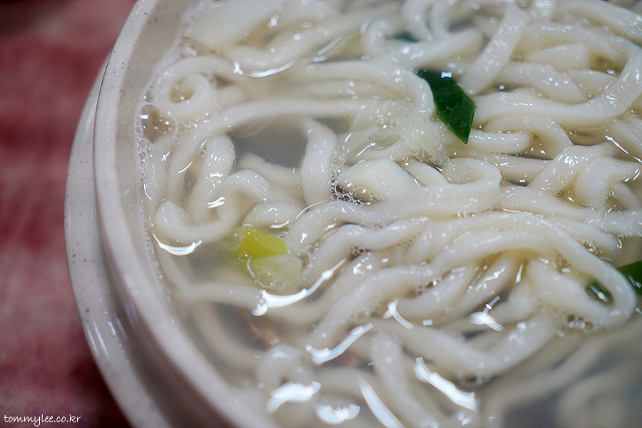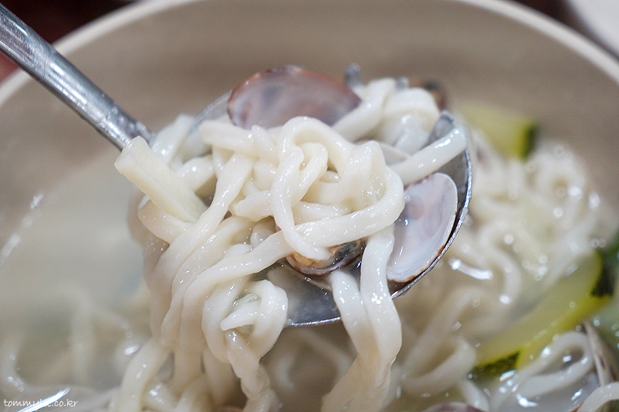 한 국자 퍼올리면 이런 느낌.. 칼국수면은 흔히 접할 수 있는 우동면이라고 보시면 됩니다.. 일본 우동의 원류는 조선의 칼국수라는 건 다들 아시죠??..