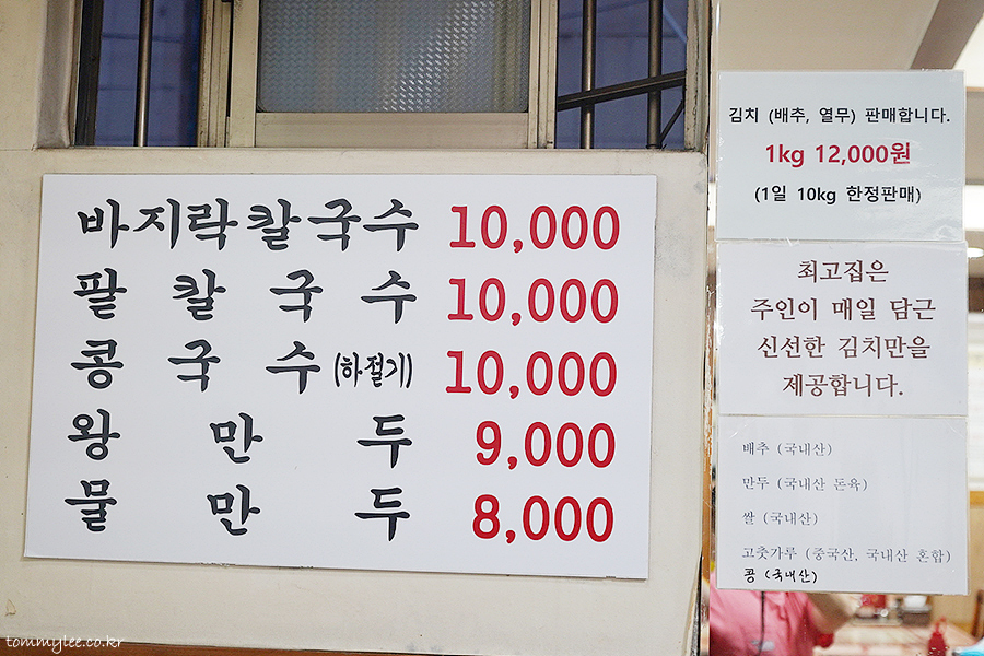 최고집 바지락 생칼국수 메뉴 및 가격.. 바지락칼국수 10,000원, 팥칼국수 10,000원, 콩국수 10,000원, 왕만두 9,000원, 물만두 8,000원.. 손님이 많아서 실내샷은 무리였네요.. 그래서 메뉴판 온리.. 맛집이긴 한가 봐요 왜 이렇게 사람이 많아.. ㅡㅡㅋ..