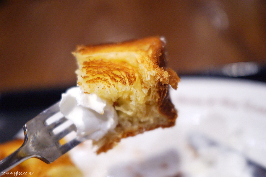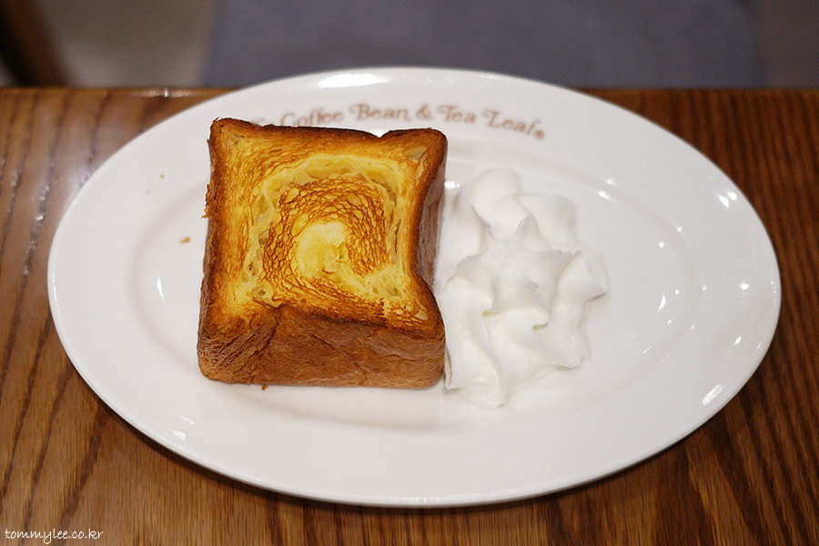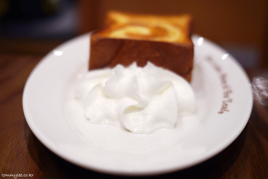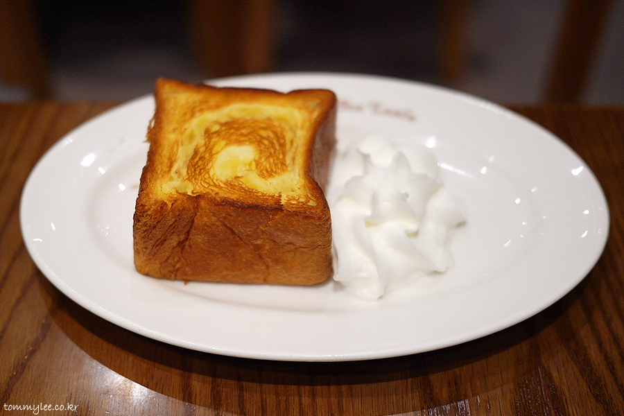 데니쉬 플레인 큐브 식빵을 위에서 바라보면 이런 느낌.. 토스트 된 플레인 식빵에 휘핑크림이 함께 제공됩니다..