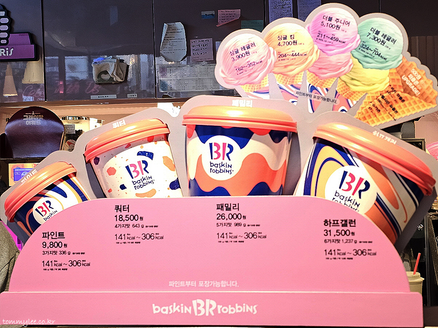 배스킨라빈스 아이스크림 사이즈 및 가격.. 싱글레귤러 3,900원, 싱글킹 4,700원, 더블주니어 5,100원, 더블레귤러 7,300원 / 파인트 9,800원, 쿼터 18,500원, 패밀리 26,000원, 하프갤런 31,500원..