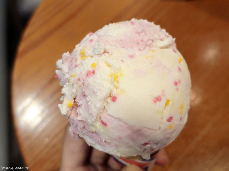 직원분께서 자리까지 아이스크림콘이랑 아이스찰떡을 가져다주셨어요.. ㄷㄷㄷ.. 제 손에 딱 요렇게 아이스크림콘을 쥐어 주심.. 목소리 큰 훈남 직원분이신데요.. 이 직원분 한정이긴 한데요.. 계시면 늘 이렇게 서빙을 해주신다죠.. 다른 배라도 여기처럼 친절했으면 좋겠다는..
