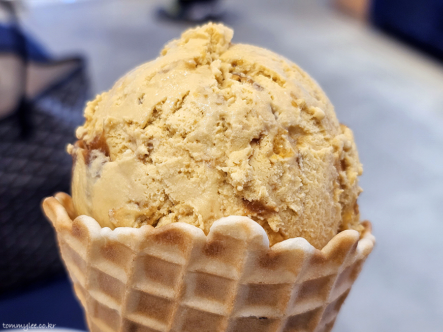 와플콘 버전의 너는 참 달고나입니다.. 카라멜 아이스크림에 솔티드카라멜 리본과 달고나가 들어가 있는 아이스크림입니다..