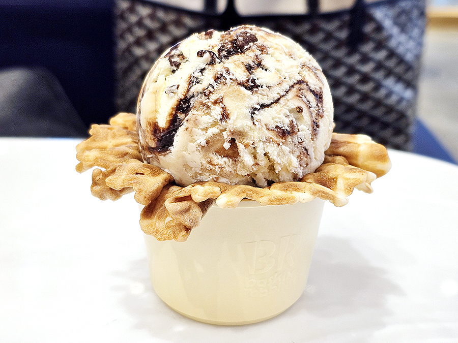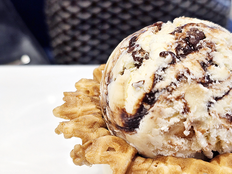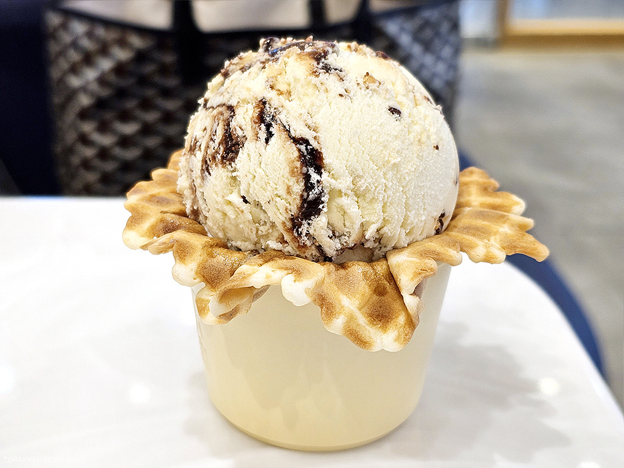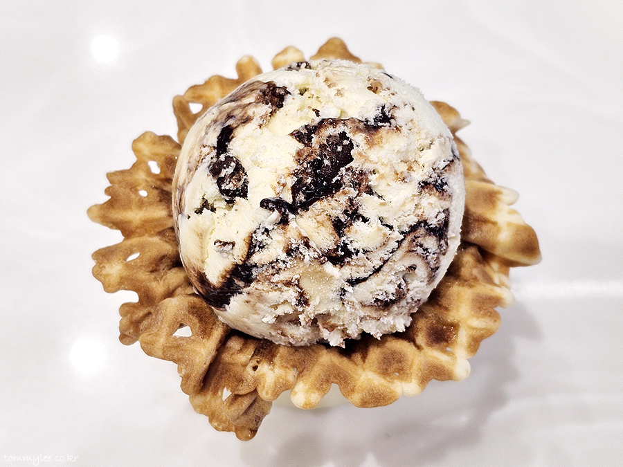 바닐라 아이스크림, 초콜릿 리본, 초코아몬드의 조합.. 아몬드맛 아이스크림이 아닌 초콜릿 코팅의 아몬드가 들어간 바닐라 아이스크림입니다..