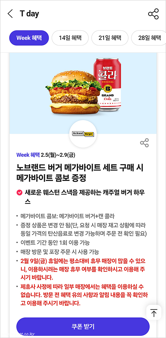 노브랜드버거는 T데이 행사 패스트푸드 카테고리 단골이고요.. 메뉴는 보통 시그니처나 메가바이트인데요.. 지난번 행사 버거 메뉴가 시그니처였기 때문에 2월에는 메가바이트가 되었습니다.. SK텔레콤은 이렇게 멤버십 이벤트가 항상 있는데요.. KT랑 U+는 정말 잠잠합니다.. 아무것도 안 함.. ㅋㅋㅋ.. 얘네 둘은 멤버십의 존재 의미가 없는 듯..