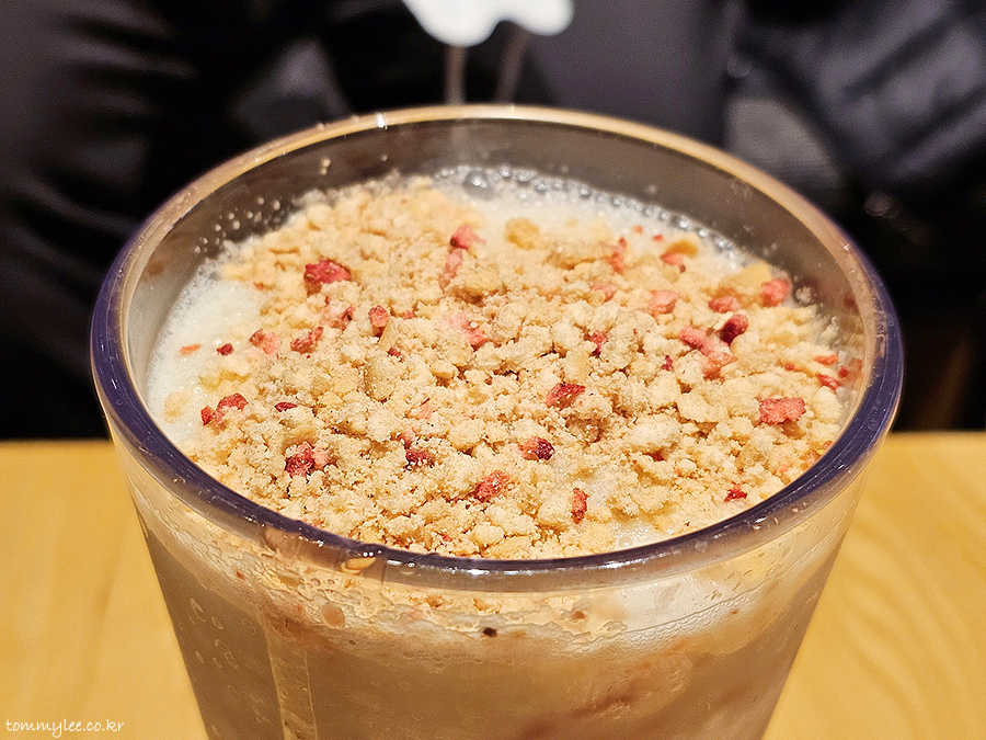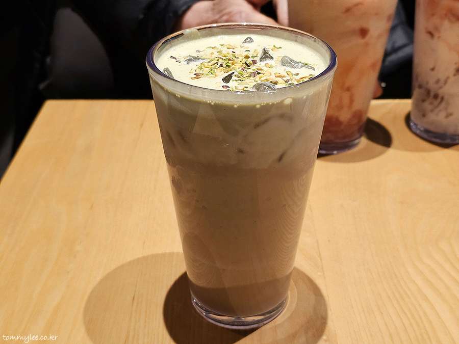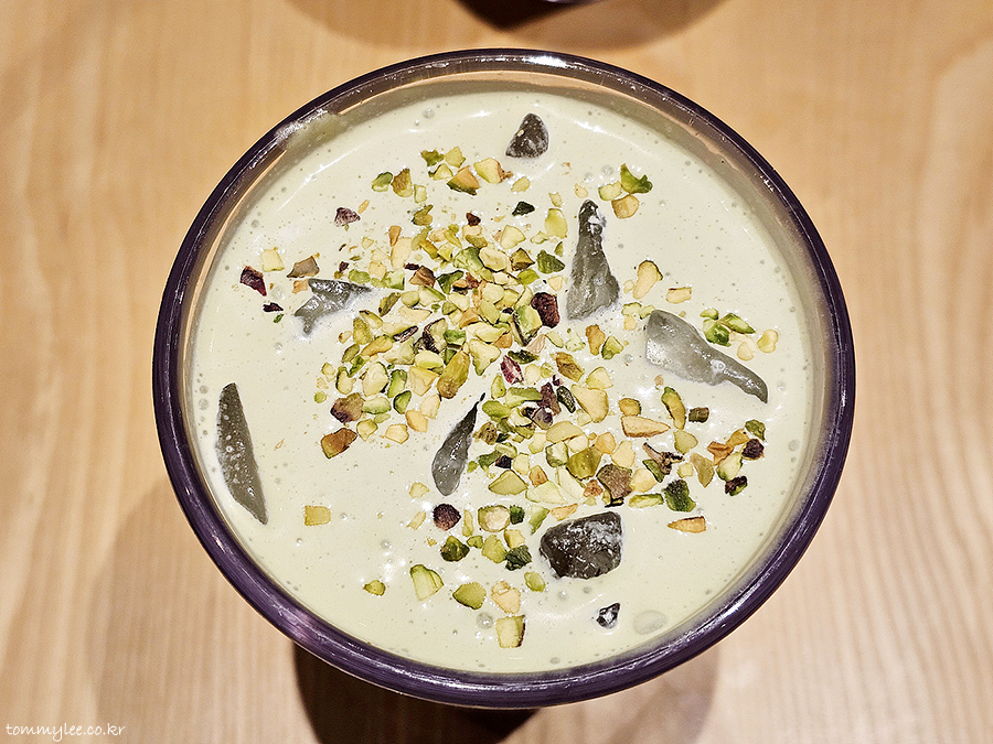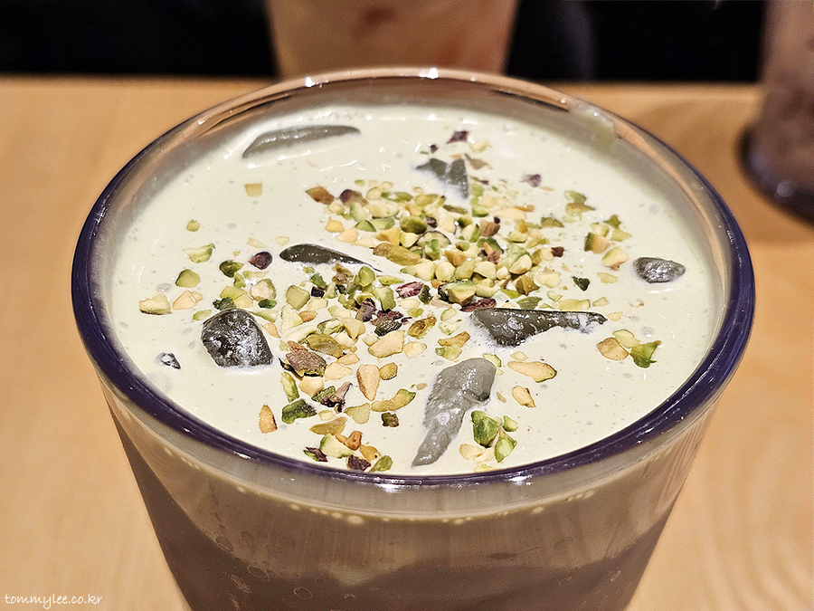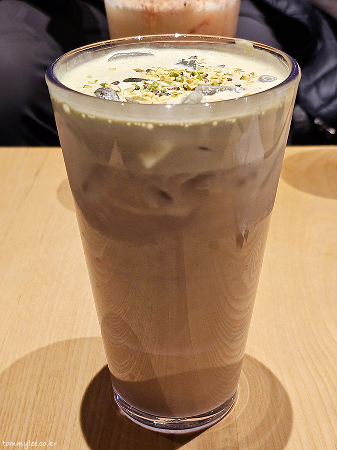 카페 라떼 위에 피스타치오 크림과 피스타치오 토핑이 올라가는 구성입니다.. 피스타치오 분태가 의외로 밝고 화사한 느낌을 주네요..