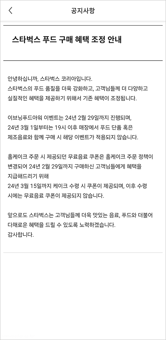 스타벅스에서 푸드 품질을 더욱 강화(?)하겠다는 명목으로 이브닝 푸드아워를 종료하게 되었다고 합니다.. 어짜피 폐기할 거면 싸게라도 파는 게 낫지 않나.. 왜 종료를 해야만 하는지 모르겠지만.. 뭐 암튼 싸게 팔기가 싫었던 모양입니다.. 이브닝 푸드아워는 2024년 2월 말로 완전 종료입니다.. ㅡㅡㅋ..