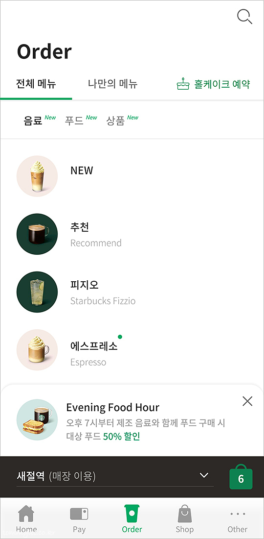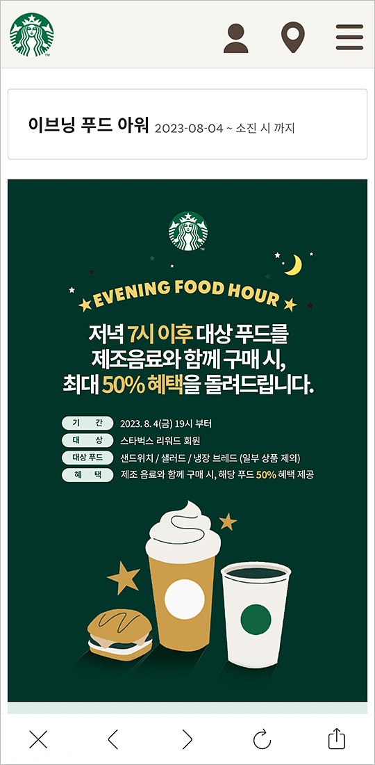 스타벅스 사이렌오더 이용할 때 이브닝 푸드아워 할인 시간대엔 이렇게 팝업이 뜨면서 할인안내를 해줬는데요.. 이것도 오늘이 마지막이네요.. 사이렌오더로도 할인받을 수 있어서 편했는데.. ㅠ.ㅠ..