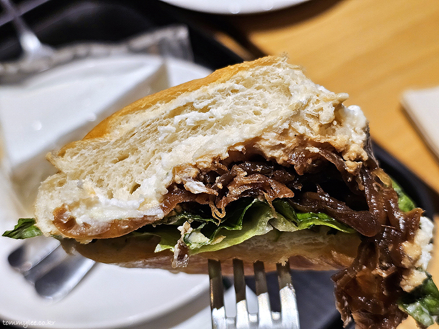 옆에서 보시면 이런 느낌.. 발사믹 식초를 넣고 졸여서 맛을 낸 발사믹 어니언이 상당히 많이 들어가 있고요.. 풍성한 맛을 선사합니다..