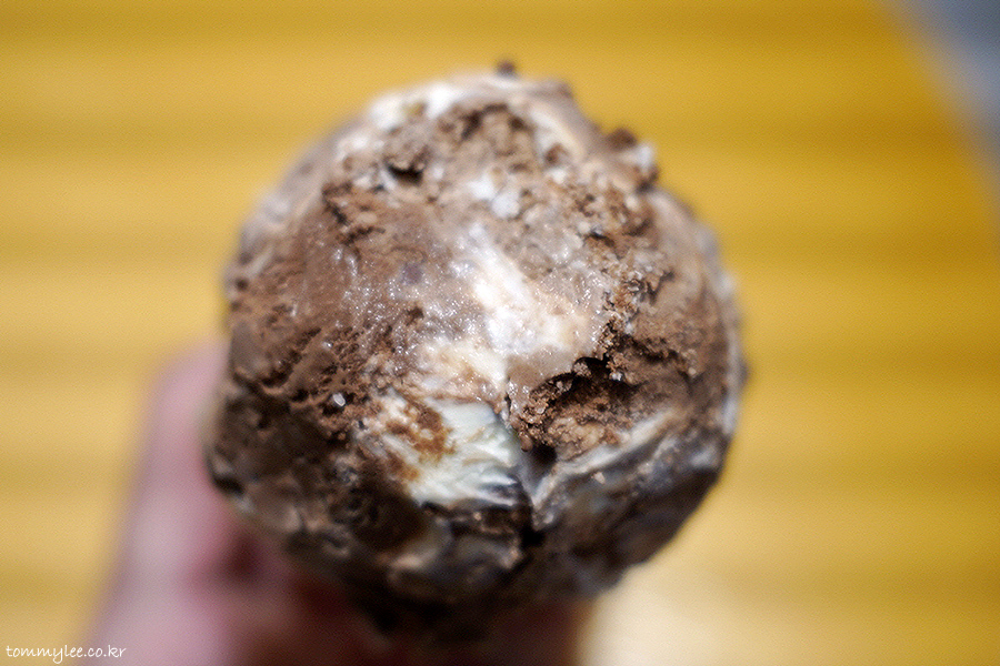엄마는외계인은 밀크초콜릿, 다크초콜릿, 화이트무스 3가지 아이스크림에 초콜릿칩, 초코볼, 초코프레첼이 더해진 화려한 구성..