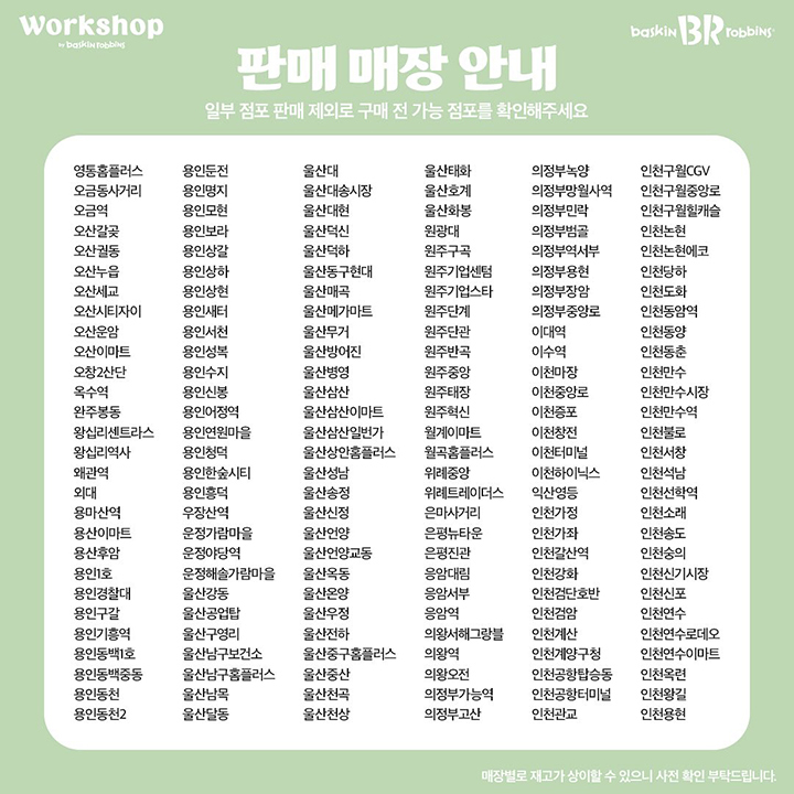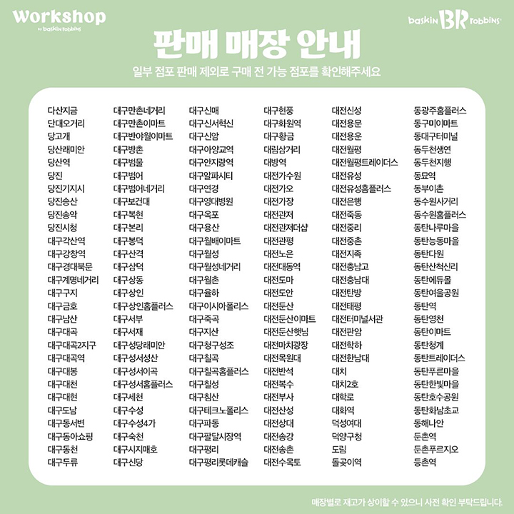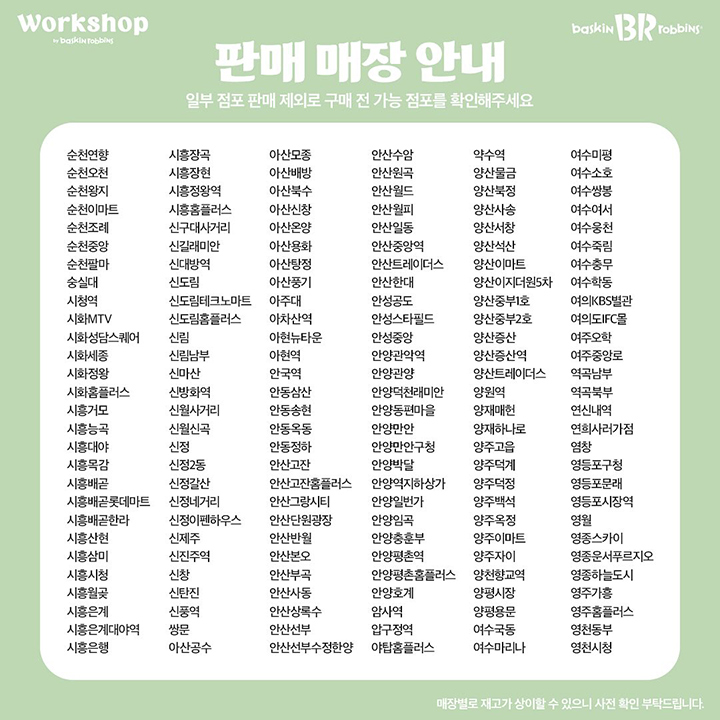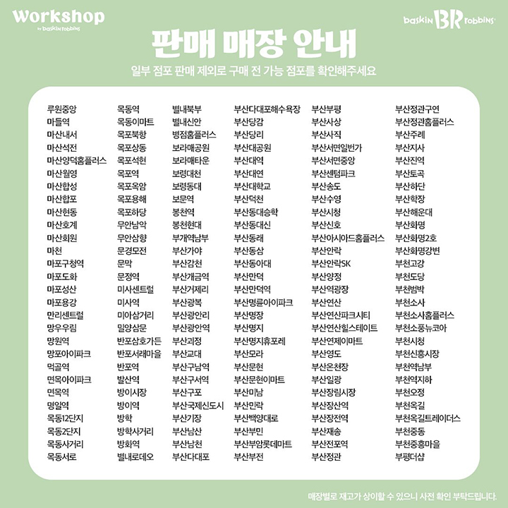 배스킨라빈스 와사비 아이스크림 판매매장 리스트입니다.. 이번 와사비 아이스크림은 화제성으로 출시한 이벤트 메뉴로 전 매장에서 판매하지 않고 일부 매장에서만 출시가 되었답니다.. 본사 차원에서의 강매는 없고 들여놓고 말고는 순수 점주 마음.. ㅡㅡㅋ..