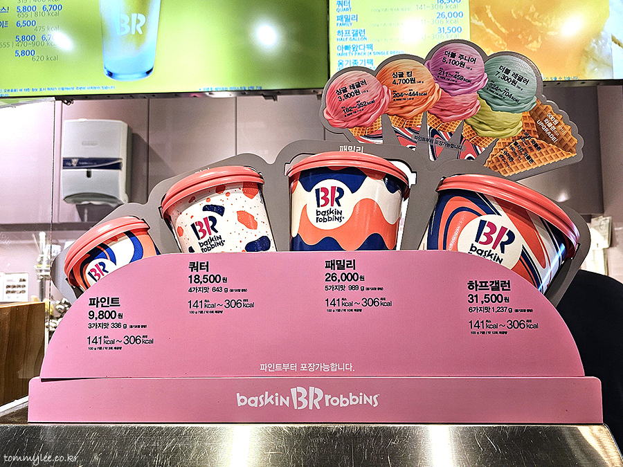 배스킨라빈스 아이스크림 사이즈 및 가격.. 싱글레귤러 3,900원, 싱글킹 4,700원, 더블주니어 5,100원, 더블레귤러 7,300원 / 파인트 9,800원, 쿼터 18,500원, 패밀리 26,000원, 하프갤런 31,500원..