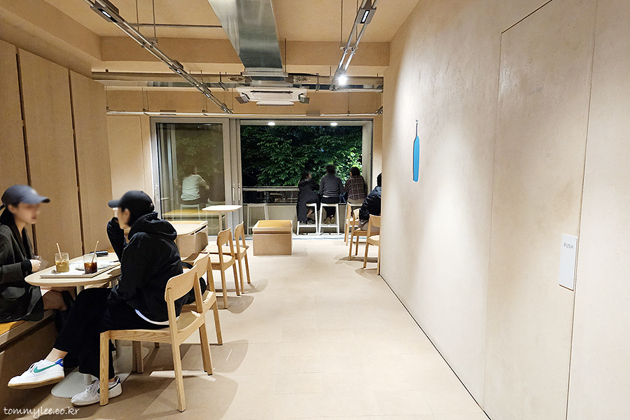 캐셔 건너편 쪽의 테이블은 뭐 이런 느낌입니다.. 블루보틀 연남카페는 경의선숲길이 보이는 카운터석이 인기가 많아요..