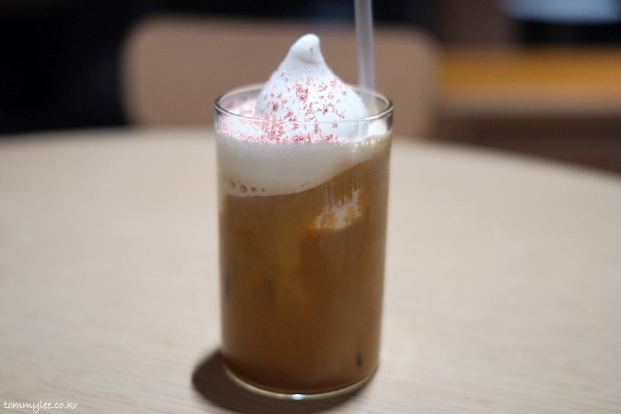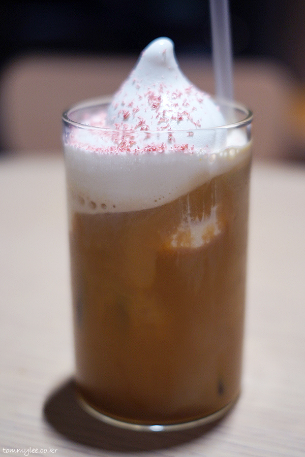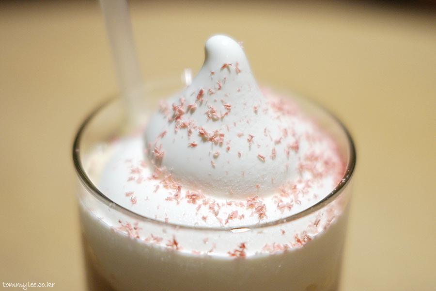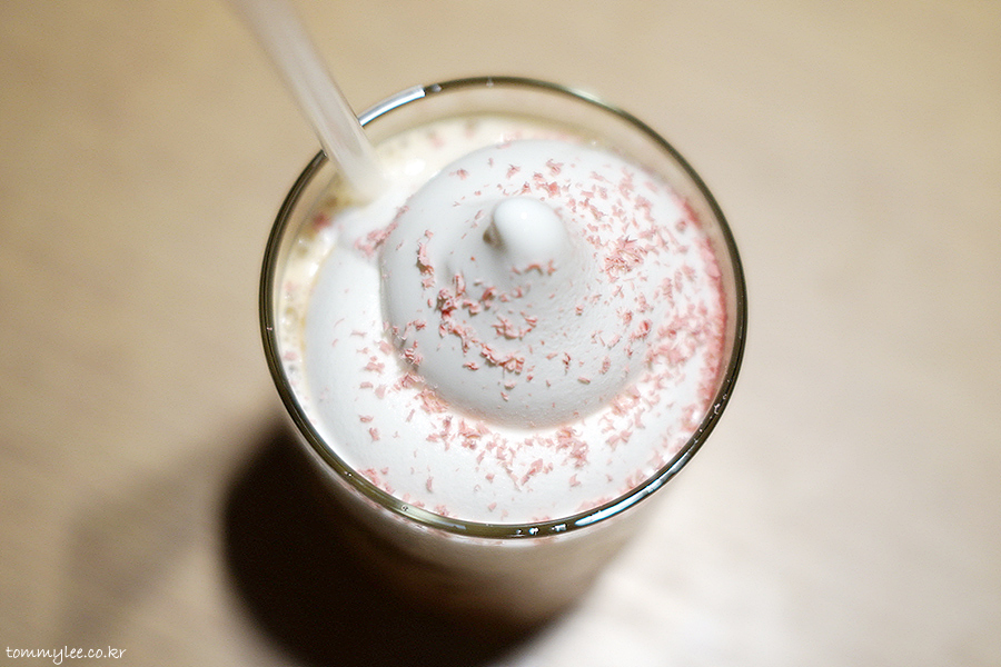 블루보틀 계절한정 메뉴인 체리블로썸 놀라 플로트입니다.. 기존 놀라플로트에 벚꽃잎 느낌의 체리블라썸 초콜릿이 뿌려진 메뉴..