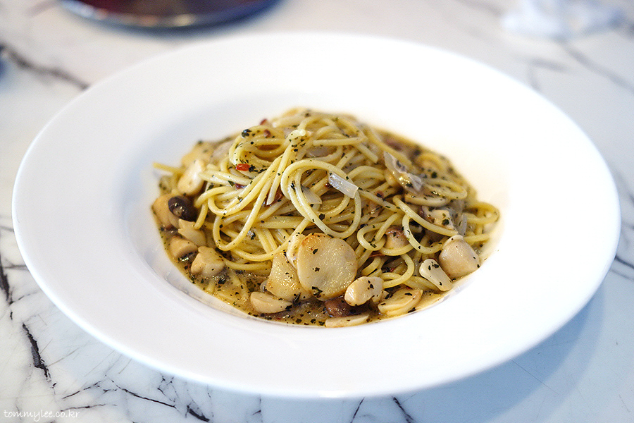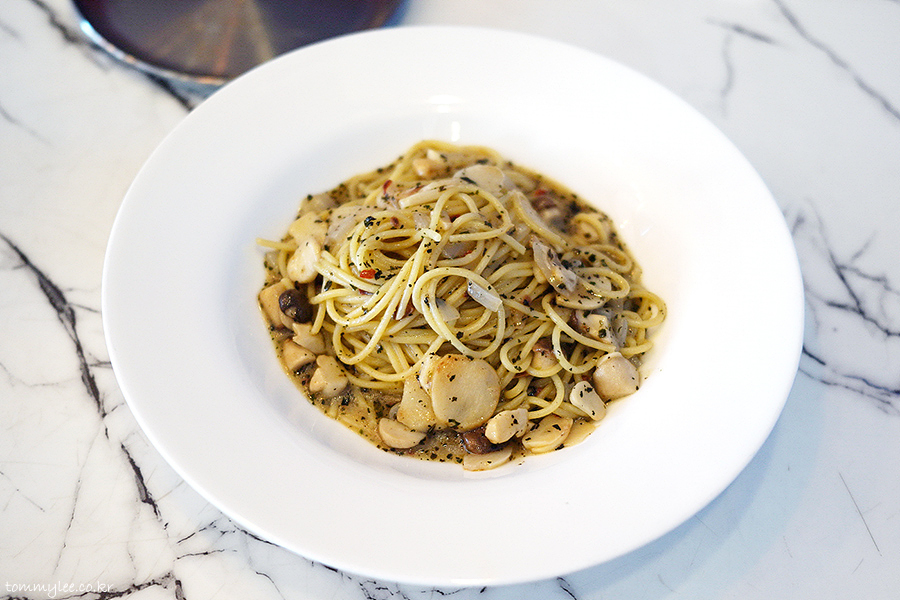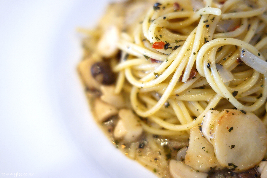 매우 저렴한 가격이지만.. 마늘과 양파에 버섯까지 재료를 아낌없이 듬뿍 넣어 볼륨이 꽤 있는 알리오올리오입니다..