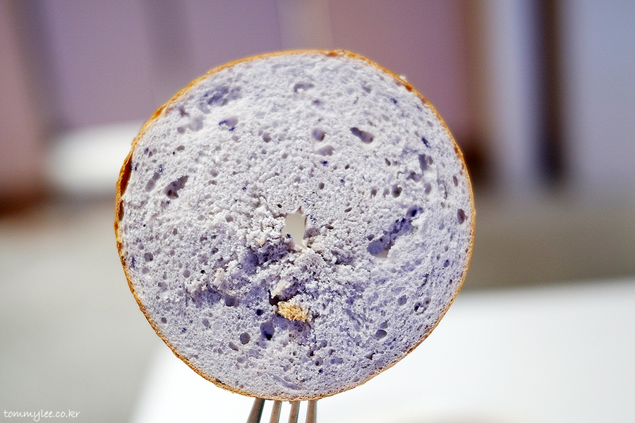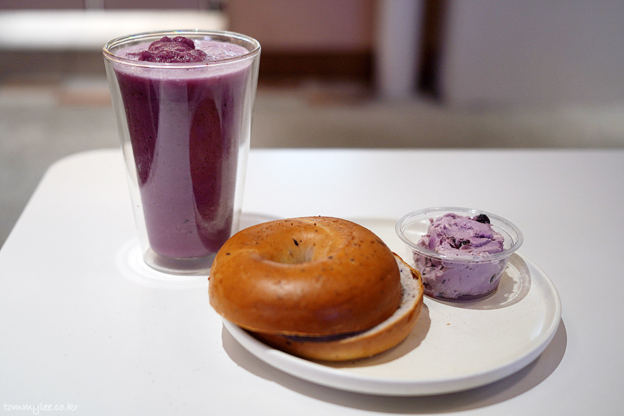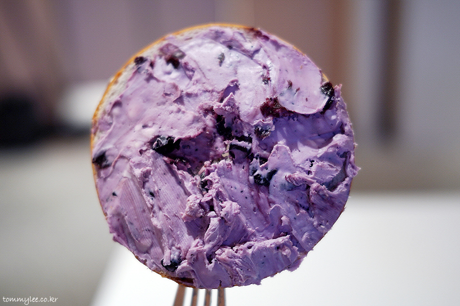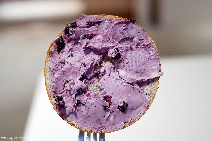 블루베리 베이글엔 블루베리 크림치즈.. 블루베리 청크가 콕콕 박힌 아름다운 색의 크림치즈.. 보라색 예쁘네요..