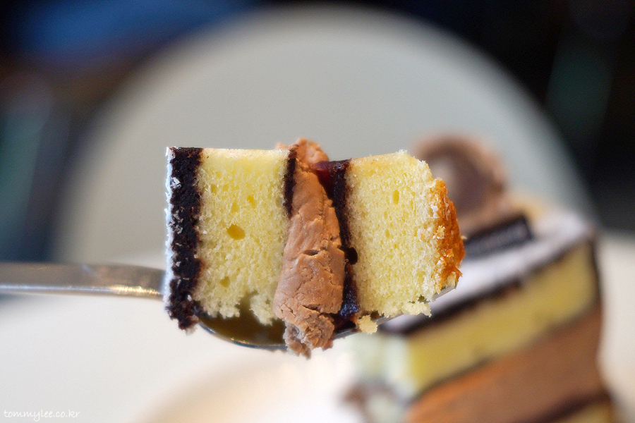 한 포크 집어 올리면 이런 느낌입니다.. 가나슈가 부드러워서 살짝만 눌러도 무너져 내리네요.. 맛은 호주식 래밍턴 케이크 충실히 재현해 냈다고 보시면 됩니다.. 딱 이렇게 와일드하고 남성적인 맛이었음.. ㅋㅋㅋ..