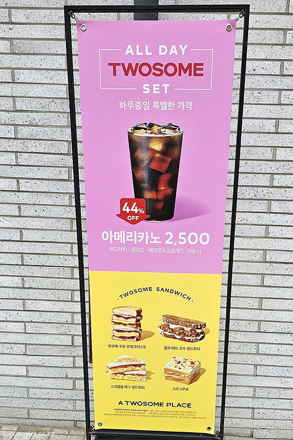 하루종일 특별한 가격.. ALL DAY TWOSOME SET.. 샌드위치 샐러드 베이글&스프레드 구매 시 아메리카노 2,500원.. 투썸이 델리 메뉴에 힘을 팍~주고 싶은 듯.. 기존 런치세트였던 두썸밀을 언제나 할인으로 확대했다고 보시면 됩니다..
