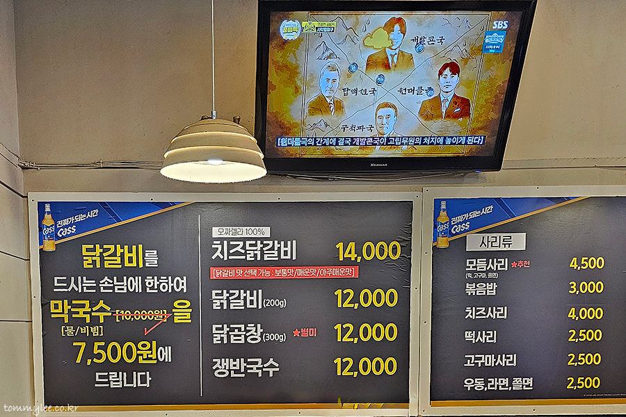 춘천본점닭갈비 메뉴 및 가격.. 닭갈비 12,000원, 치즈닭갈비 14,000원, 닭곱창 12,000원, 쟁반국수 12,000원 / 모듬사리 4,500원, 볶음밥 3,000원, 치즈사리 4,000원, 떡사리 2,500원, 고구마사리 2,500원, 면사리 2,500원..