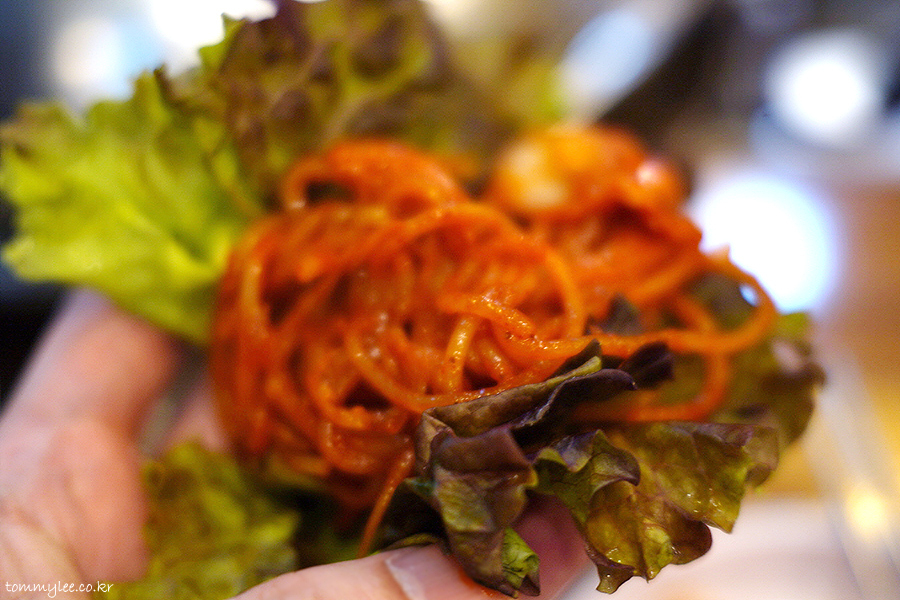 닭갈비 양념을 머금은 쫄면을 상추에 싸서 냠냐므..