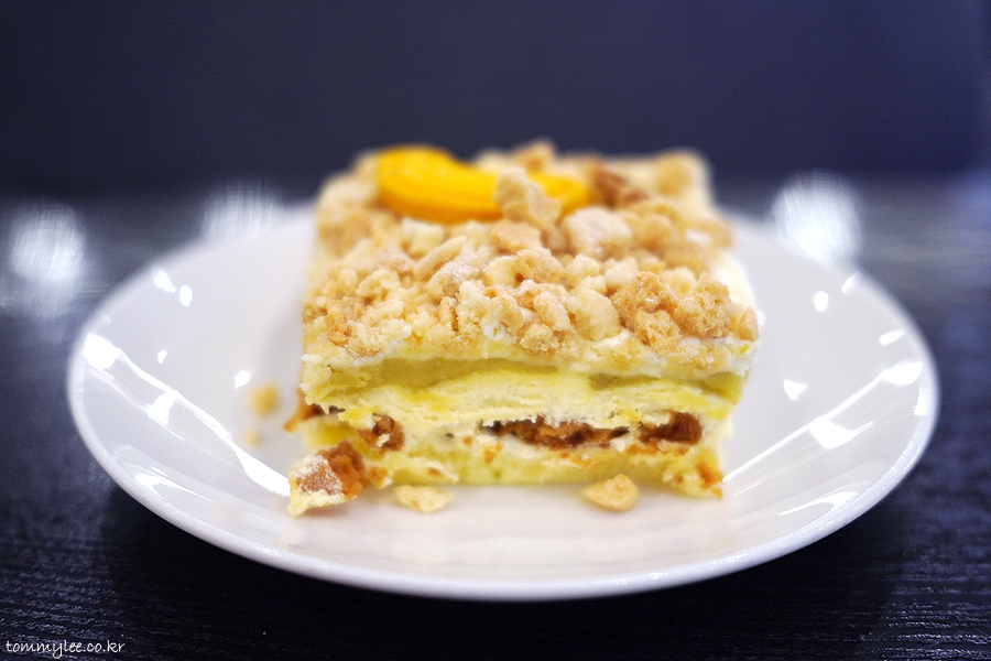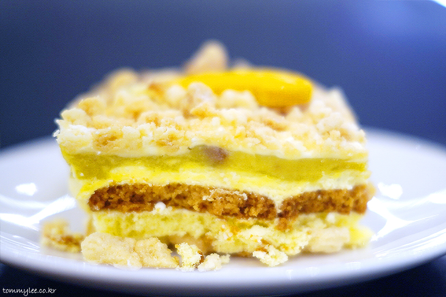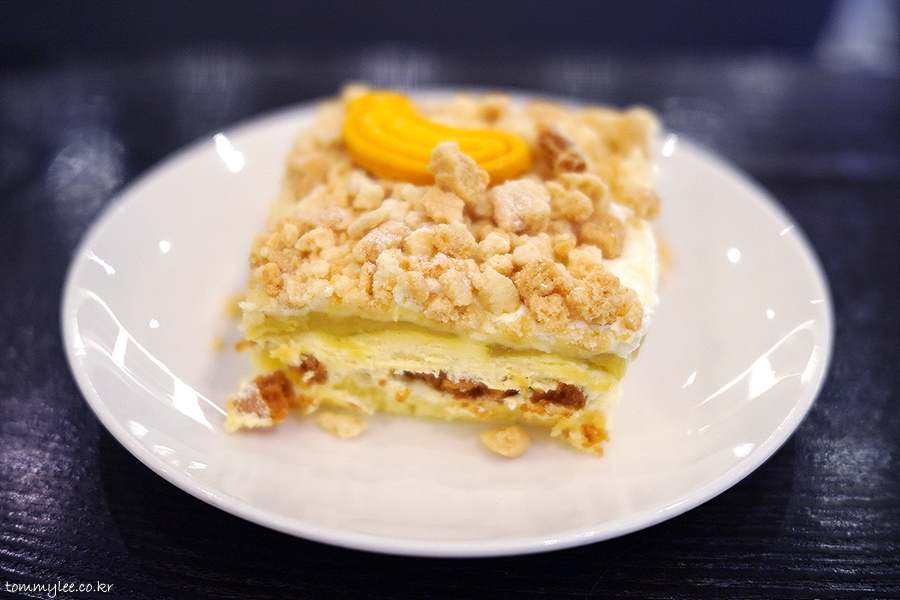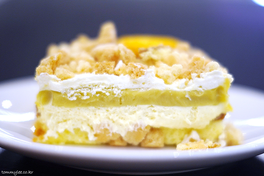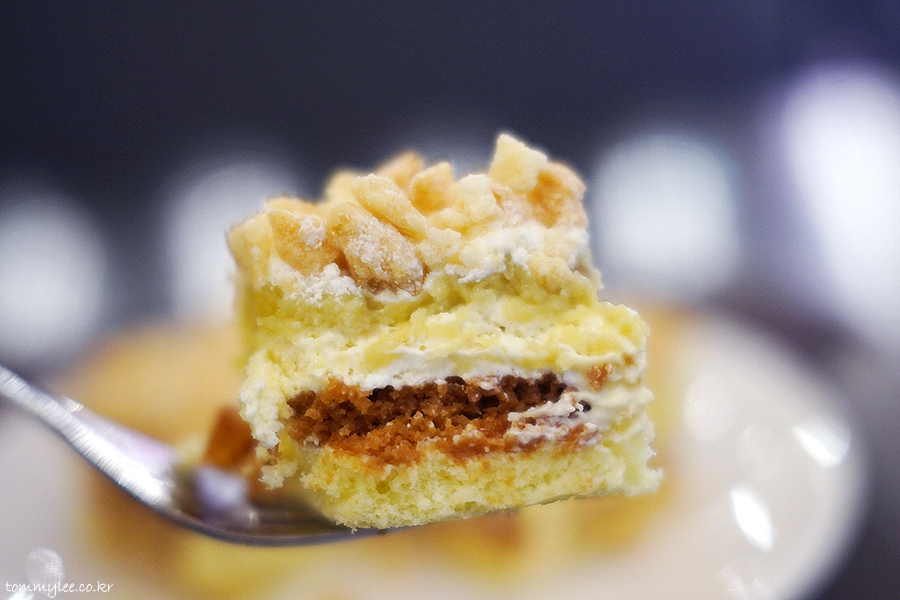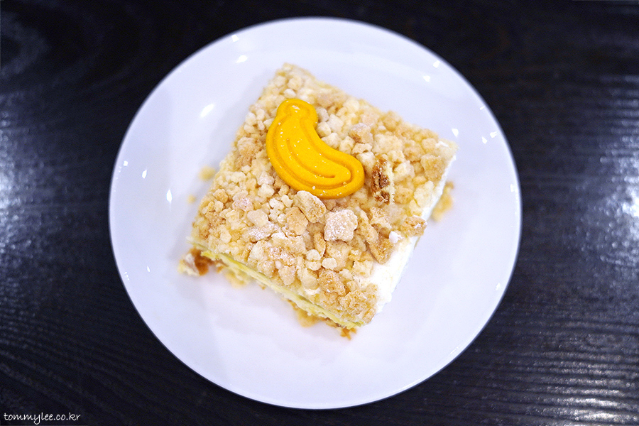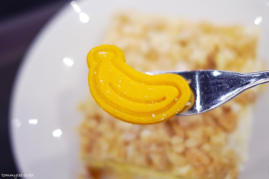 넉넉하게 올려진 크럼블과 케이크 시트 사이에 바닐라 크림과 바나나 커스터드 크림, 버터 비스킷이 샌드 되어 있는데.. 조합이 꽤 괜찮아요..
