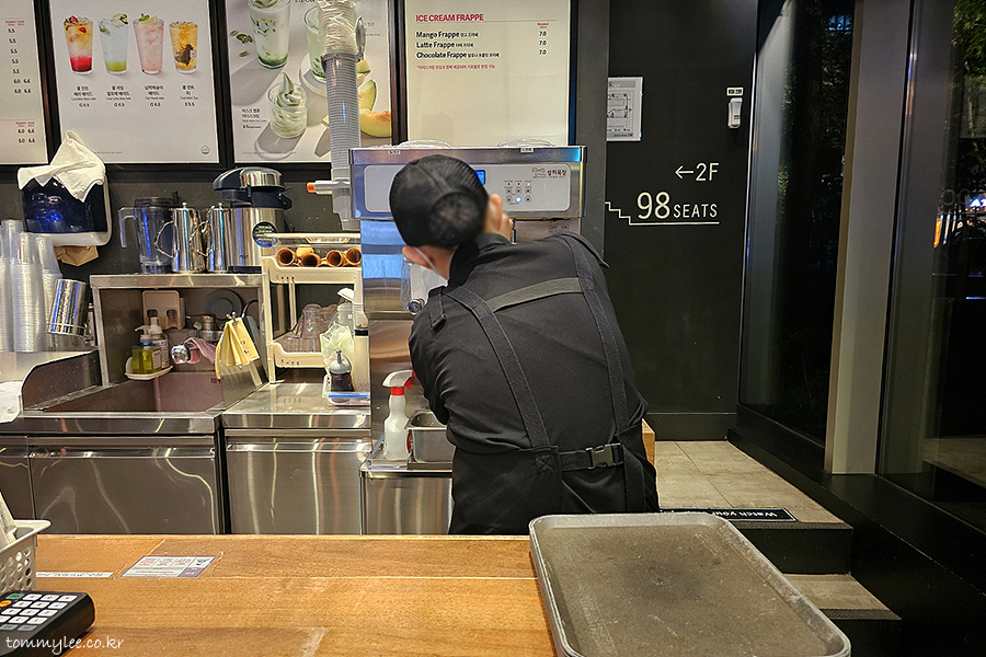 영업종료 15분 전에 겨우 주문했네요.. 살짝 위험했다~.. 소프트 아이스크림을 뽑아 주고 계신 바리스타님 찰칵..