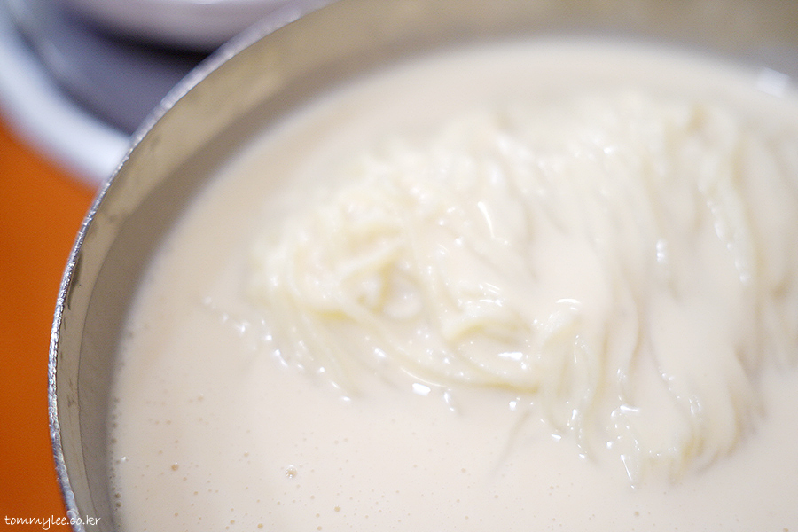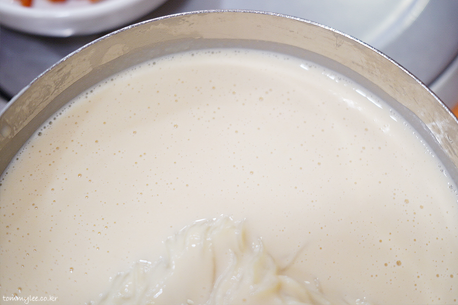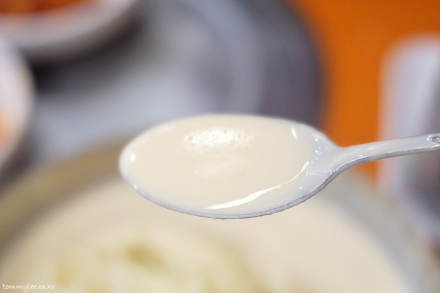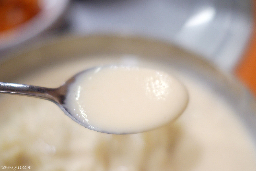숟가락으로 콩물을 퍼올리면 요런 느낌.. 간이 딱 맞아서 그냥 그대로 드시면 된다는 거..