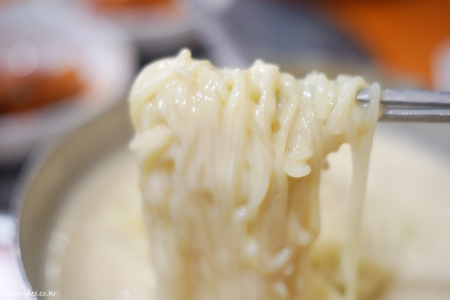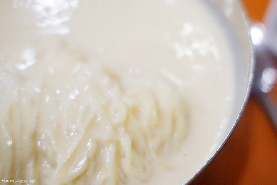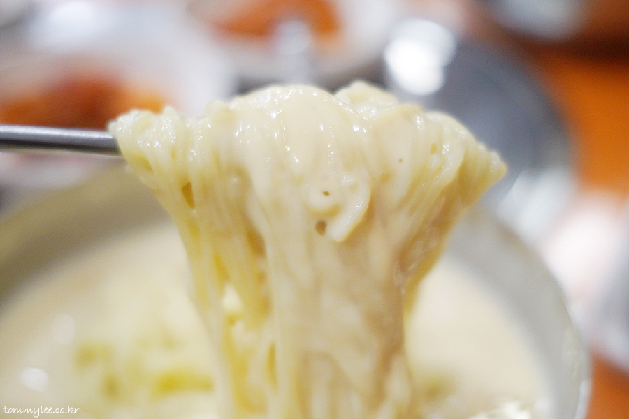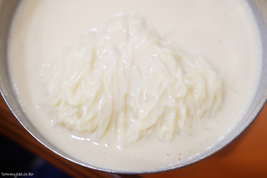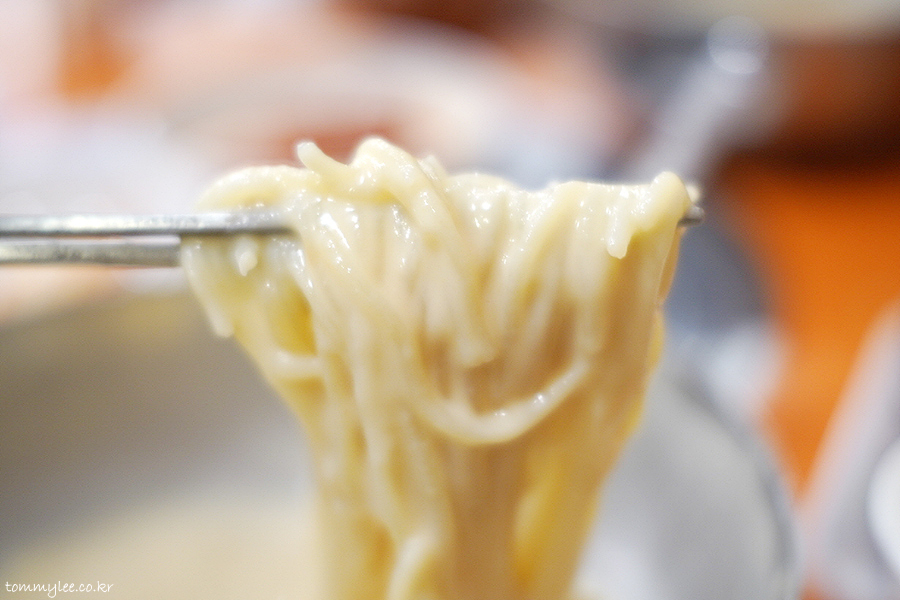 젓가락으로 콩국수를 집어 들면 이런 느낌.. 콩물이 찐득해서 국수가 하나가 된 느낌으로 딸려 올라오고요..