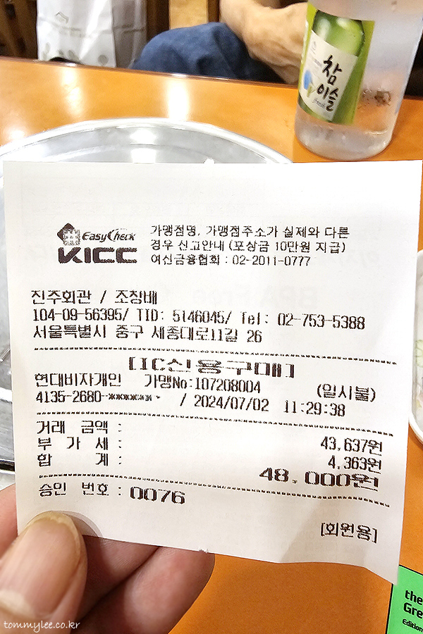 진주회관 내돈내산 영수증 인증샷.. 콩국수 3그릇이 48,000원.. 내년엔 5만원대가 될 듯..
