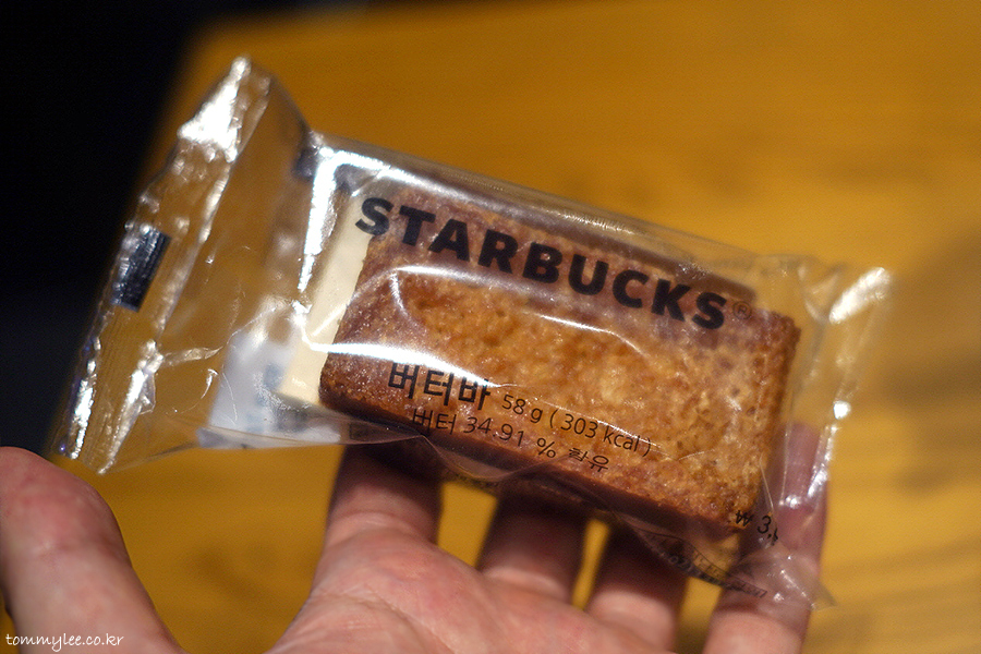스타벅스 버터바를 옆에서 바라보면 이런 느낌.. 도톰해서 한 입에 들어가면 딱인 사이즈감..