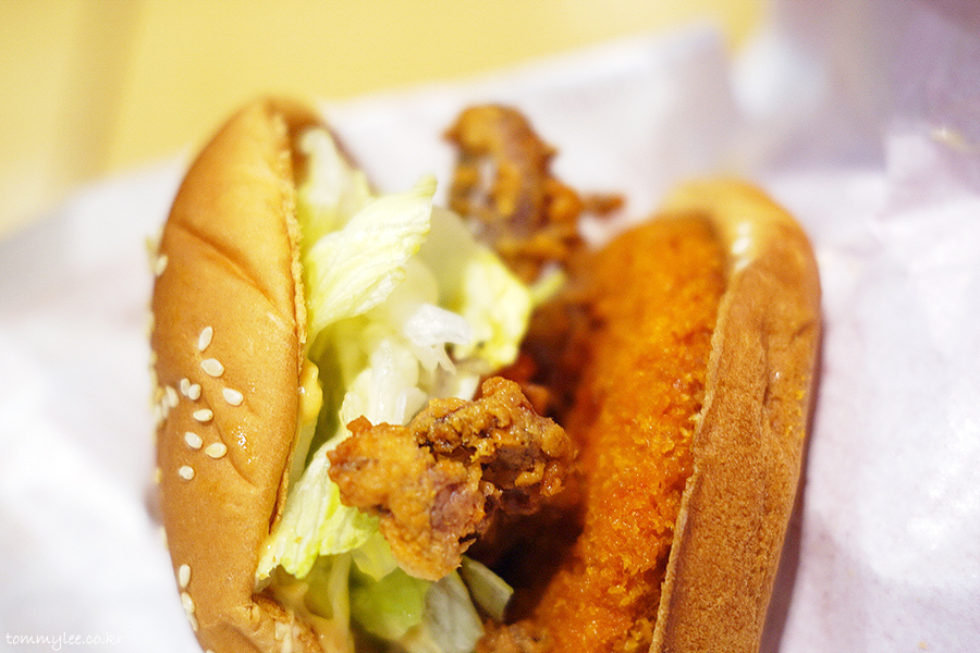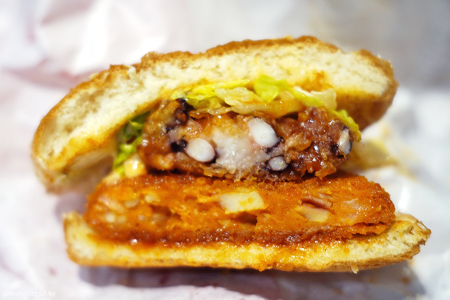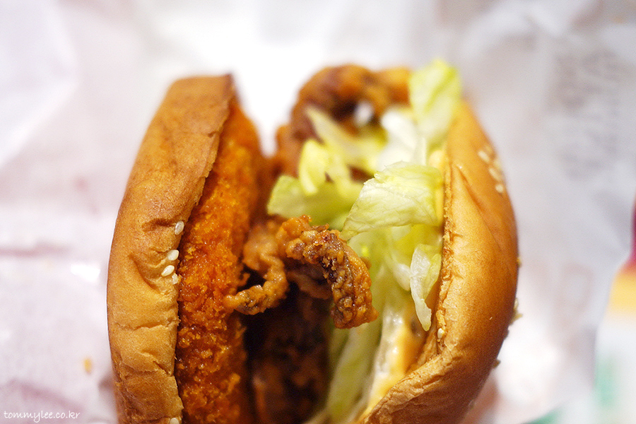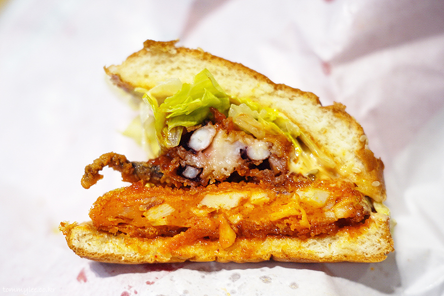 버거를 커팅해 보면 이런 느낌.. 눈으로 보는 것만으로도 매운맛을 충분히 짐작할 수 있는 오징어 패티의 모습이고요.. 오징어다리 튀김은 원물 형태를 그대로를 살려서 아름답게 튀겨낸 것이 특징..