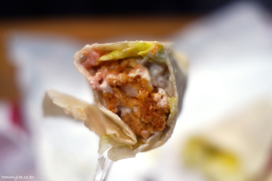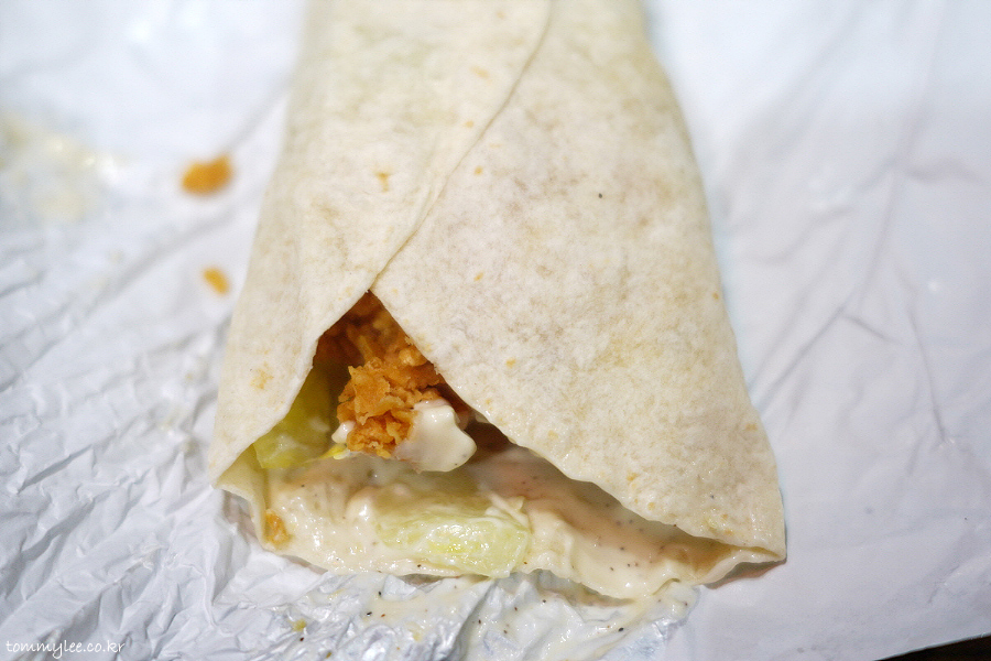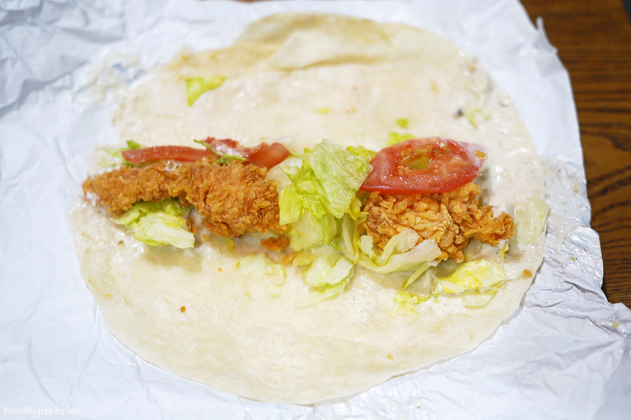 트위스터 내용물 확인을 위해 오픈해보면 이런 느낌입니다.. 밀또띠아 안에 치킨텐더 2조각, 양상추, 토마토에 마요네즈..