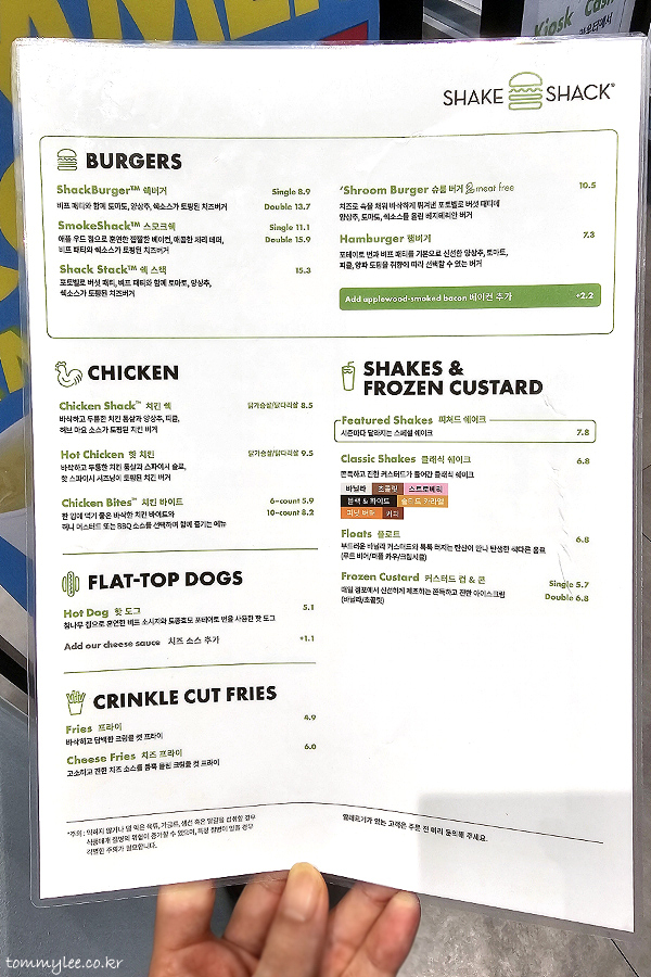 쉐이크쉑 메뉴판이 되겠습니다.. 주요 메뉴 가격은.. 쉑버거 8,900원, 치킨쉑 8,500원, 핫도그 5,100원, 프라이 4,900원, 클래식쉐이크 6,800원입니다..