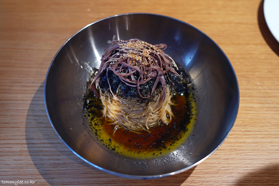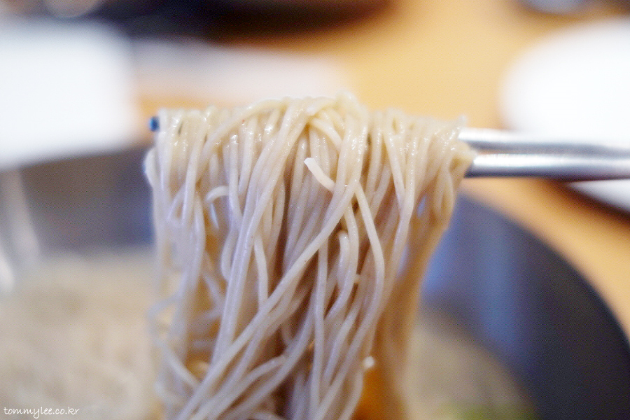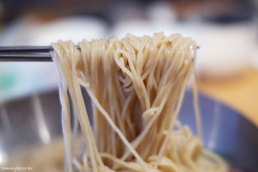 마치 뜨개실처럼 동글동글 말아 올린 메밀면입니다.. 뭐랄까 면덩어리가 풀기 힘들어 보이긴 하지만 볼륨이 있어 보여요.. 양이 많진 않은데 많아 보이는.. ㅋㅋㅋ..