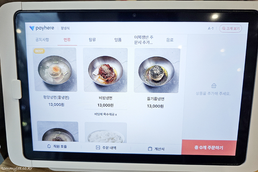 페이히어 테블릿 메뉴판을 사용하고 있고요.. 테이블에서 주문과 직원호출은 가능하지만 결제는 캐셔 이용하셔야 한다고 하네요..
