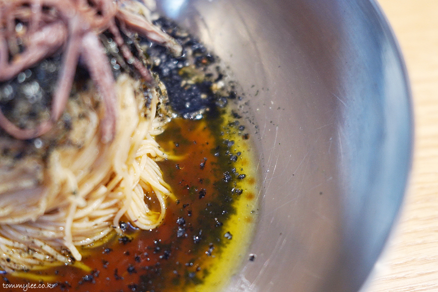 들기름냉면 저한텐 별미긴 한데.. 들기름에 익숙하지 않을 경우 적응이 힘들긴 하겠어요.. 호불호가 많이 갈리는 메뉴라 들기름계 비빔국수 경험이 없다면 신중하게 주문하셔야 할 듯..