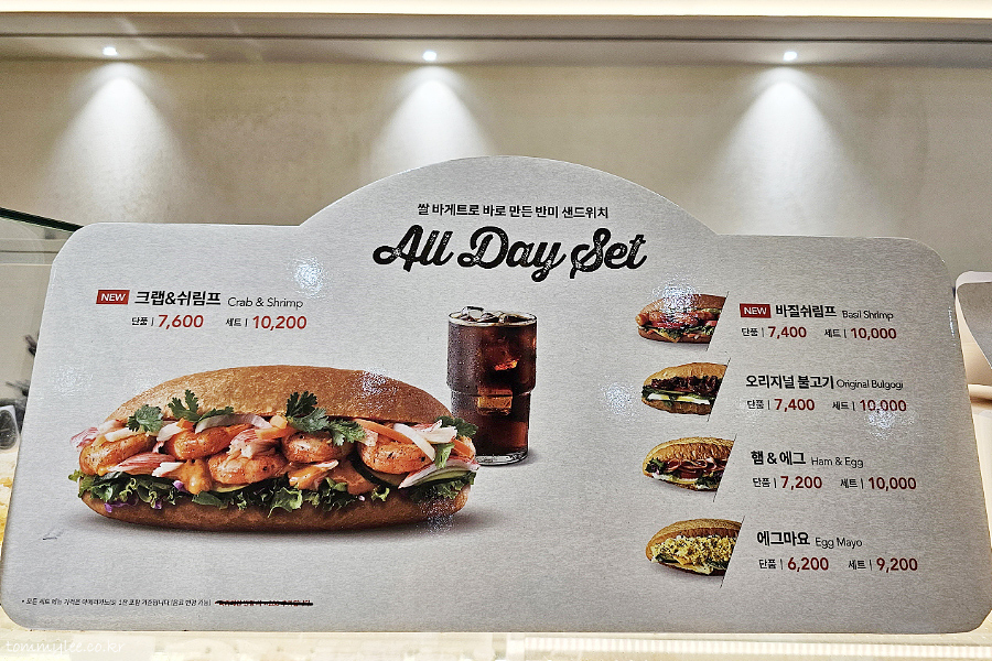 엔제리너스 반미 샌드위치 세트 가격은.. 크랩&쉬림프 7,600원/10,200원, 바질쉬림프 7,400원/10,000원, 오리지널불고기 7,400원/10,000원, 햄&에그 7,200원/10,000원, 에그마요 6,200원/9,200원..