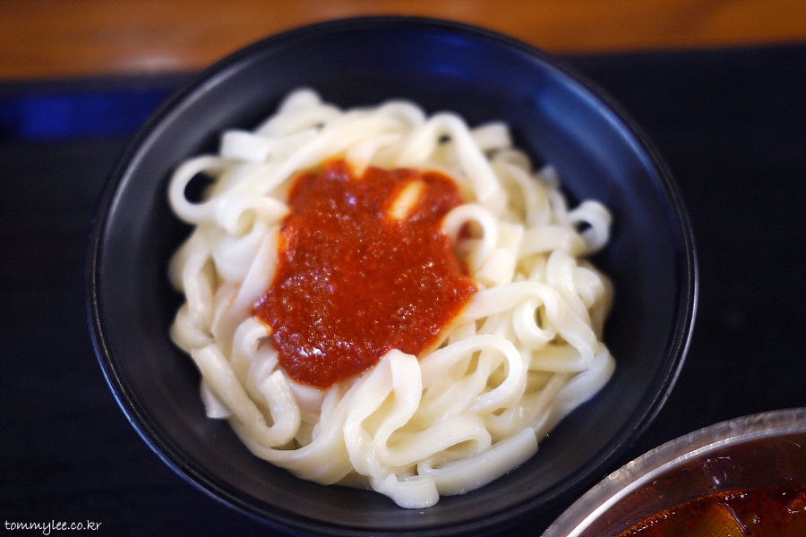 다대기가 올라간 우동면입니다.. 이 면을 육개장에 넣어서 드시면 육개장 칼국수가 되는 거라는..