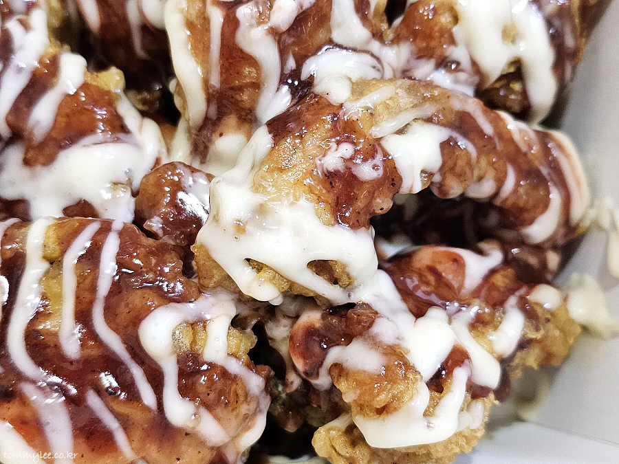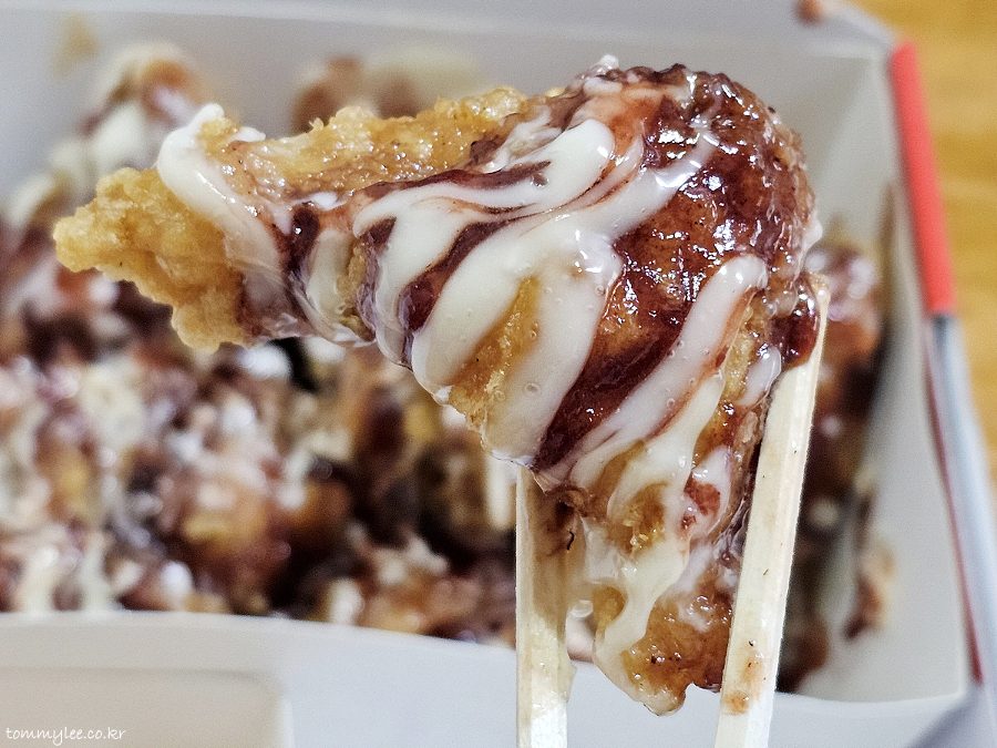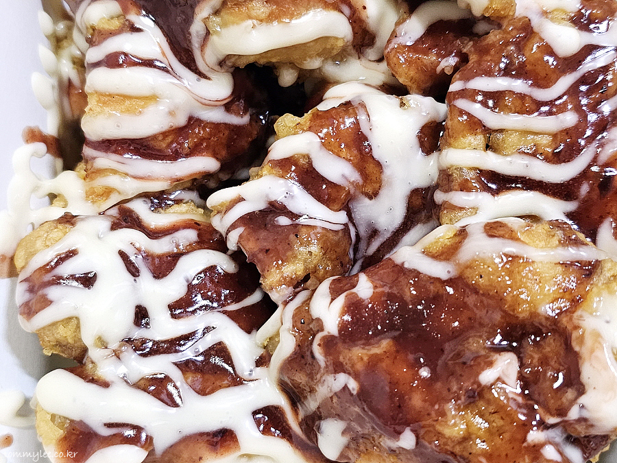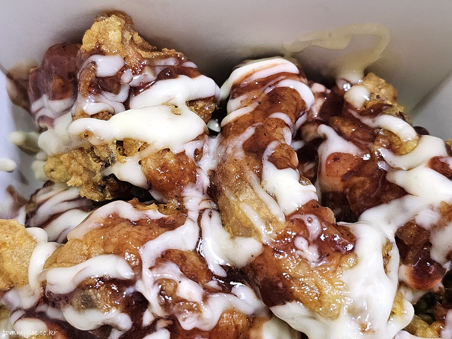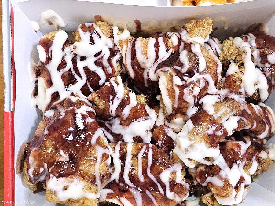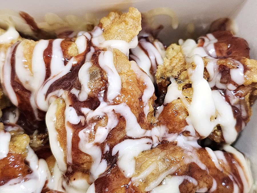 처갓집 특유의 폭신한 튀김옷에 레드와인 소스와 슈프림 소스가 사이좋게 반반씩 토핑 되어 있는 구성이랍니다..