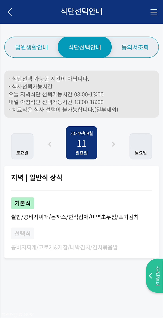중식을 제외한 조식과 석식은 쌀밥 대신 다른 종류가 나오는 선택식을 고를 수가 있는데요.. MY세브란스앱에서 선택식을 고를 수가 있답니다.. 근데 타임리밋이 있으니 주의해야 해요.. 선택식 저녁식단은 당일 08:00~13:00 신청가능.. 명일 아침식단은 금일 13:00~18:00에 신청이 가능하다고 합니다.. 선택식이 유리한(?) 경우가 많으니 미리미리 식단을 확인하는 자세가 중요하겠습니다..