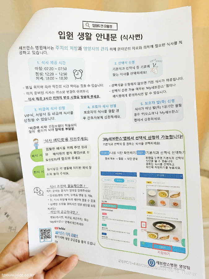 가장 중요한 건 역시 먹는 거죠.. 이 '입원생활 안내문 식사편'이 저에겐 너무나도 중요했습니다.. 식사제공 시간은 아침 07:20~07:50, 점심 12:20~12:50, 저녁 18:00~18:30.. 선택식은 마이세브란스 앱에서 신청가능.. 보호자 식사 신청도 가능하다고 합니다.. 밥만 추가 신청할 수 있는 건 좋네요..
