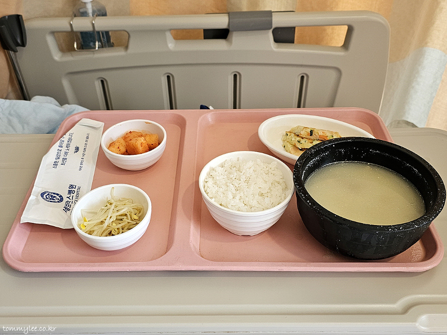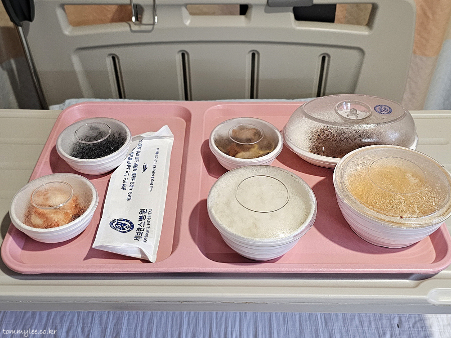 그나저나 테이블까지의 서빙은 배식 담당 직원분께서 도와주시지만 식기를 치우는 건 셀프.. 완전 환자의 몫이더군요.. 목발의 제가 이 트레이를 들고 수평을 유지하면서 병실 밖의 퇴식 카트까지 이동하는 것은 불가능해 반납 포기함.. 이래서 보호자가 필요하구나 싶었음.. ㅠ.ㅠ.. 결국 건너편 보호자분께서 치우는 거 도와주심.. ㅠ.ㅠ..