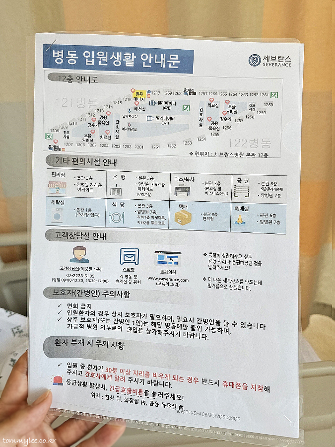 세브란스병원 본관은 이렇게 생겼답니다.. 암병원이랑 비스꾸리하게 생기긴 했어요.. 암튼 세브란스병원 본관 병동 중간층 정도인 12층 122동으로 배정을 받았어요.. 정형외과 입원을 하시면 저랑 비슷하게 12X동으로 배정받지 않으실까 생각됩니다..