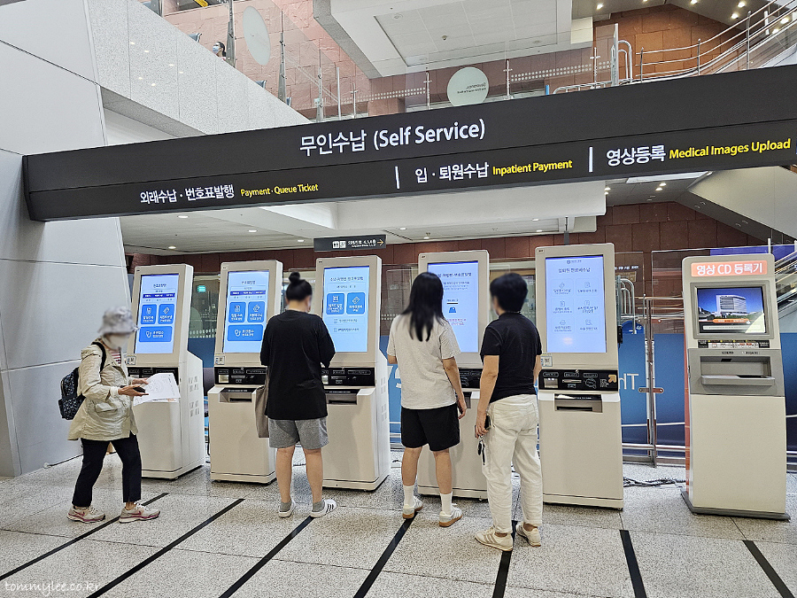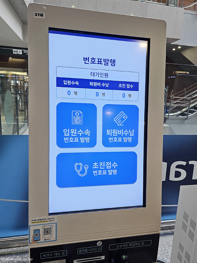 입원수속을 위해 번호표를 받아야 했는데.. 어디에도 번호표 기계가 안 보이는 거예요.. 요즘은 번호표도 이 키오스크로 발급한다고 합니다.. 병원 키오스크답게 화면 사이즈 엄청 크고 글씨도 엄청 큼.. ㅡㅡ;;..