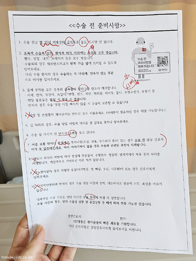 수술 전 준비사항.. 수술 전날 밤 12시 이후부터 금식으로.. 물마저도 마시면 안되는 퍼펙트 금식.. 초록색 수술복 상의, 환자복 바지 이외에는 속옷을 모두 벗습니다.. 수술실 가기 전 반드시 소변을 보고 갑니다.. 이름 모를 약이나 항생제에 특이사항이 있는 경우 수술 전 담당 강호사에게 꼭 미리 이야기..