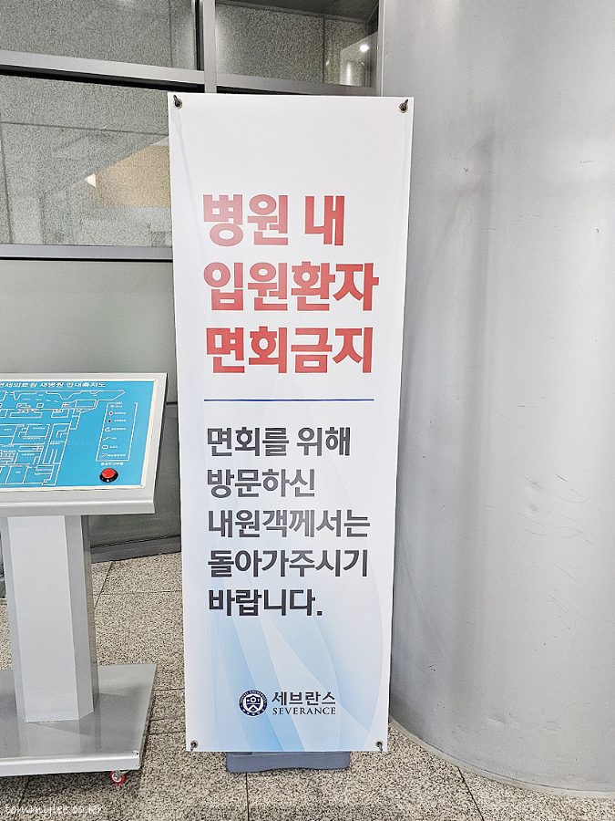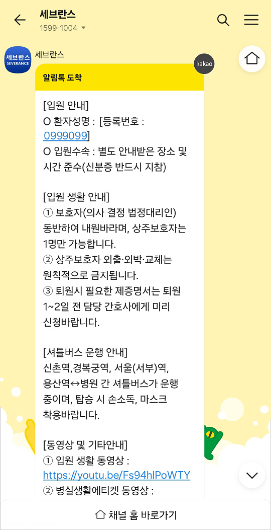 수술 일정이 잡히고 입원 날짜가 다가오게 되면 카카오톡으로 이렇게 입원안내 메시지가 오게 됩니다.. 세브란스병원 입원생활 안내문 내용은 보호자 동반하여 내원 바라며, 상주 보호자는 1명만 가능하단 거.. 저는 위중한 상태는 아니었던지라 보호자는 굳이 필요가 없고 환자 본인만 내원하면 된다고 하심.. 환자 컨디션에 따라 보호자가 필수는 아니라는 거..