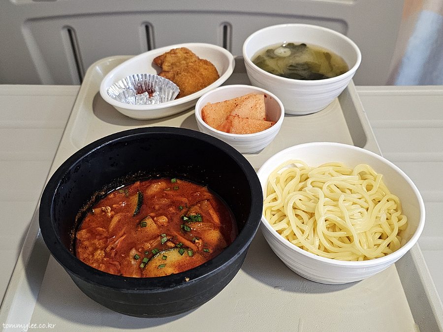 처음이자 마지막 선택식입니다.. 제육비빔면이 나온다고 해서 선택을 안 할 수가 없었어요.. 두툼한 뚝배기에 제육볶음이 담겨져 있고, 우동면이 사리 형태로 따로 제공되는 형식입니다..